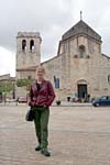 sheila in front of the church in the center square in besalu. this romanesque church is st. pere's, built in 977 and the sole remnant of besalu's benedictine monastery. two lions decorating its entrance symbolize strength and loyalty.